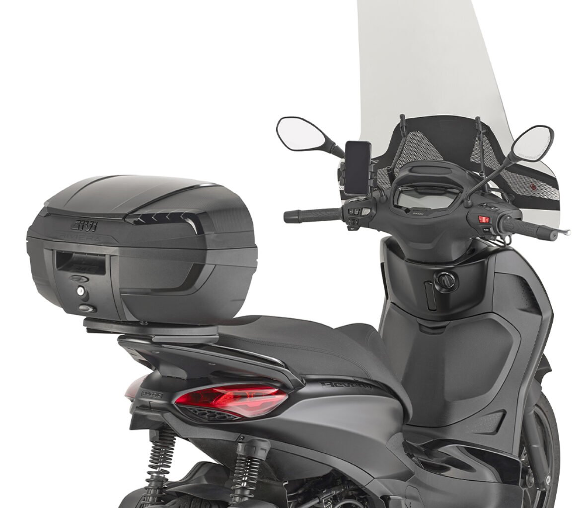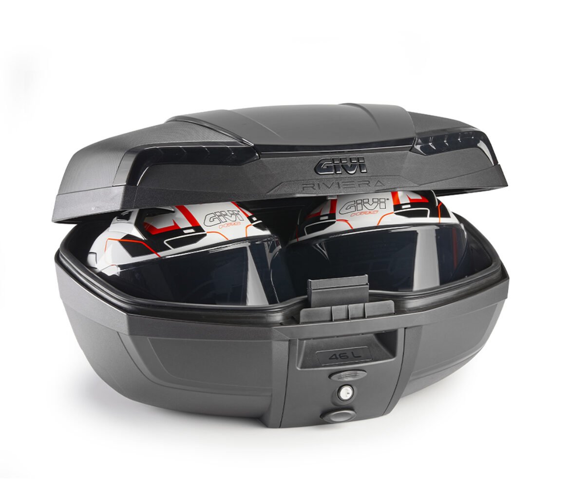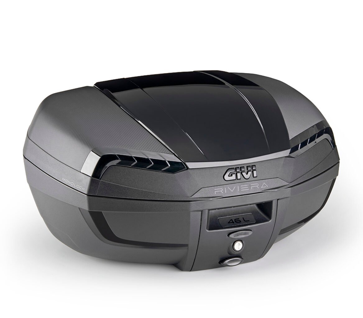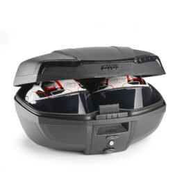 MONOLOCK® 46 ltr top-case black with black cover, internally painted smoked reflectors, universal mounting plate included.