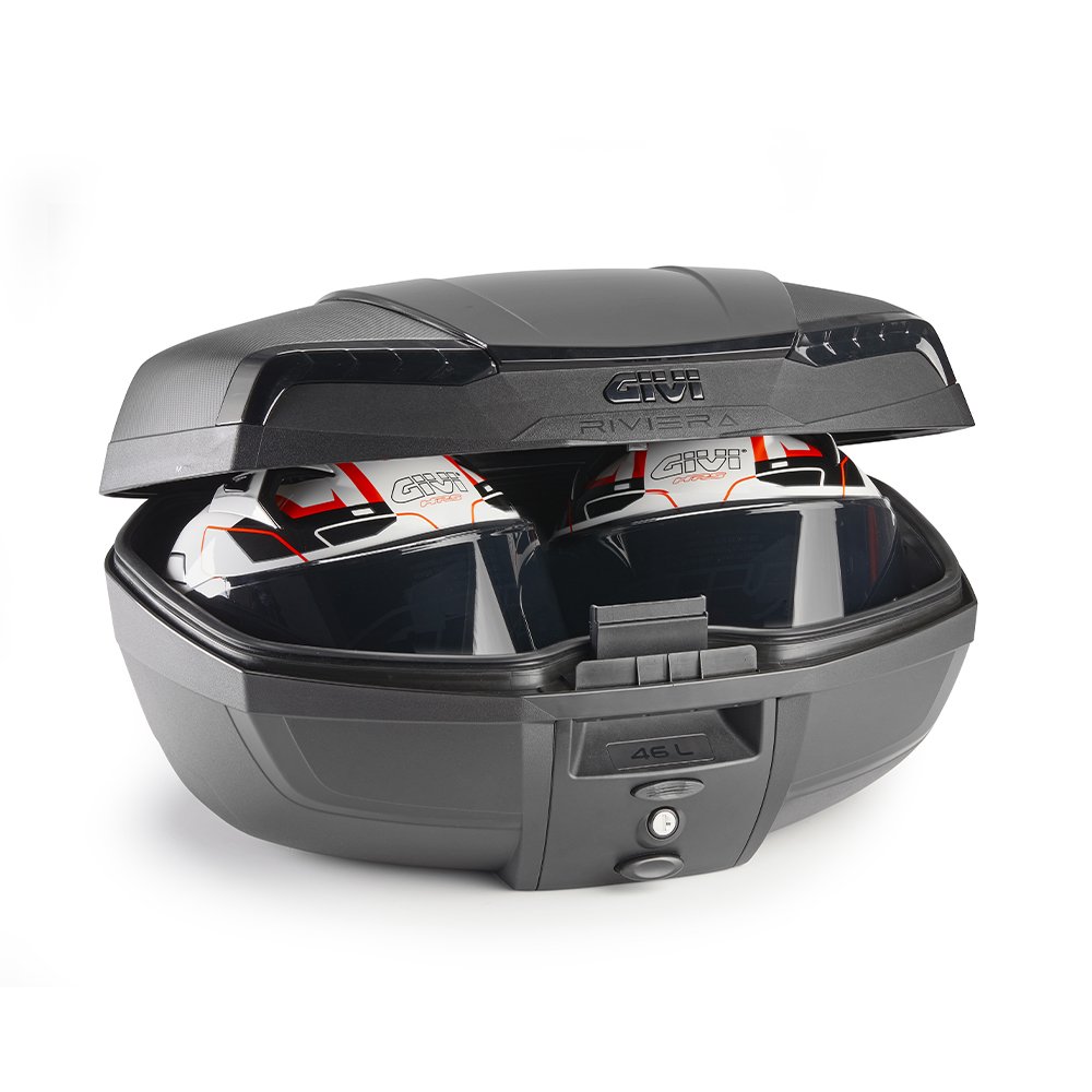MONOLOCK® 46 ltr top-case black with black cover, internally painted smoked reflectors, universal mounting plate included.