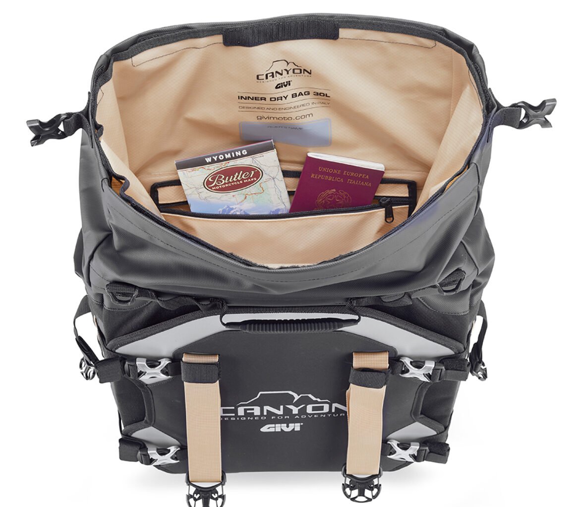 - Removable and waterproof sand-coloured inner bag with high-frequency heat-sealing, resistant to heavy rain and extreme conditions