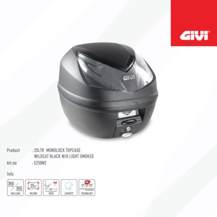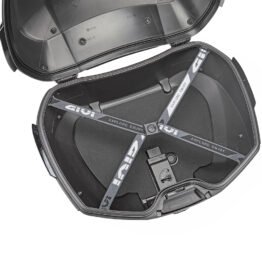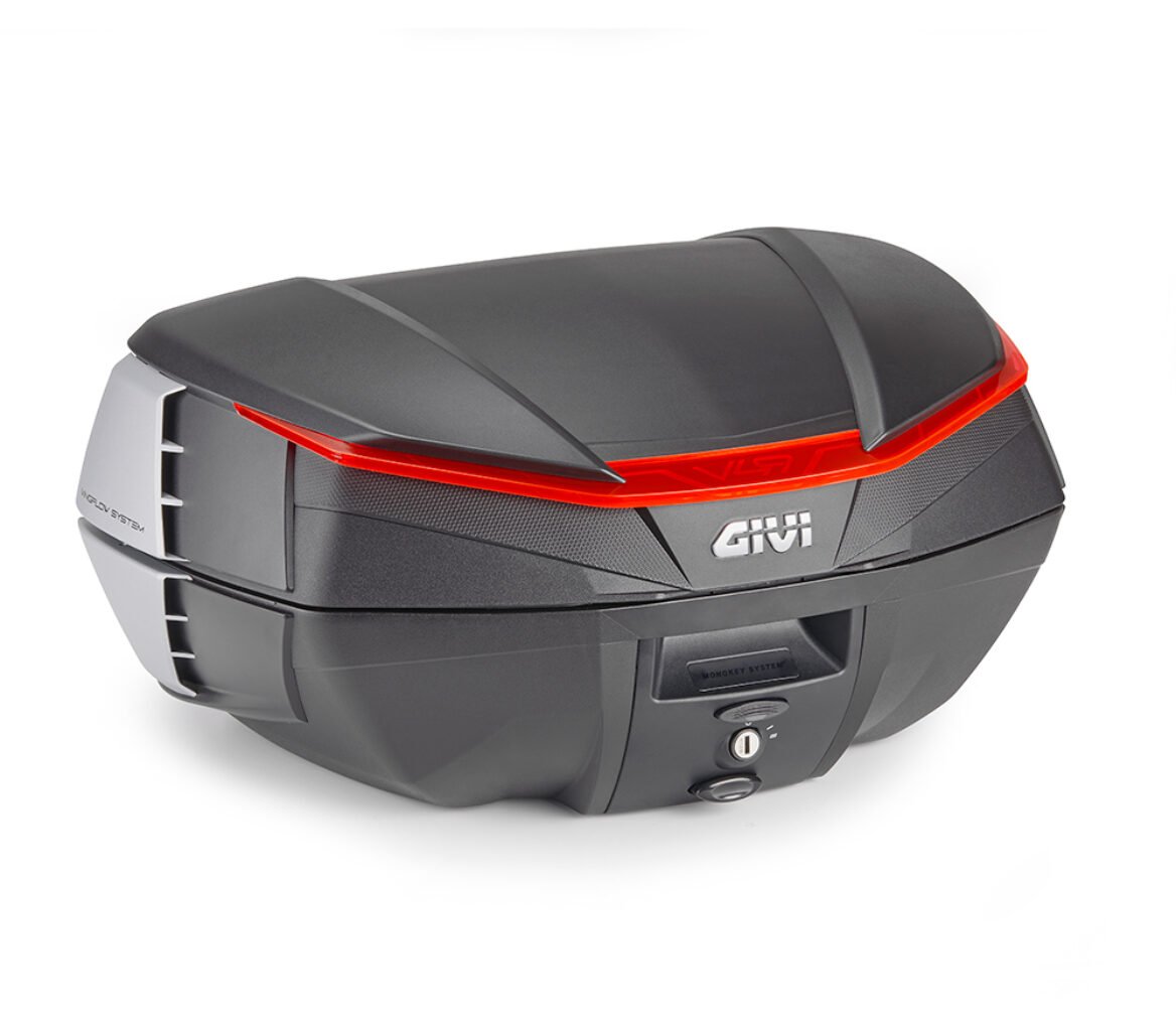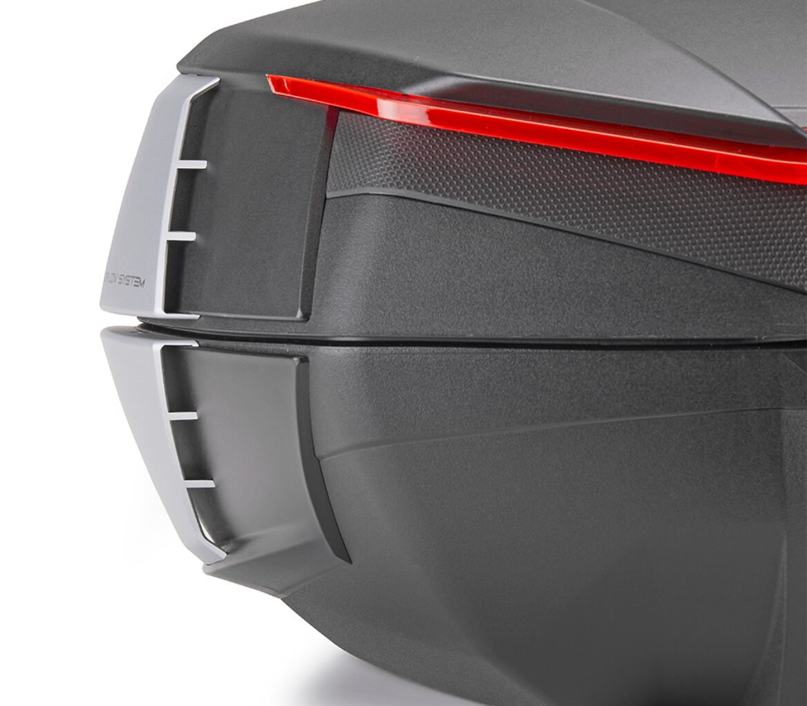 V49 Air top Case, black with red reflector and four black paintable covers. With 2 Wingflow System wings on each side, painted in silver colour